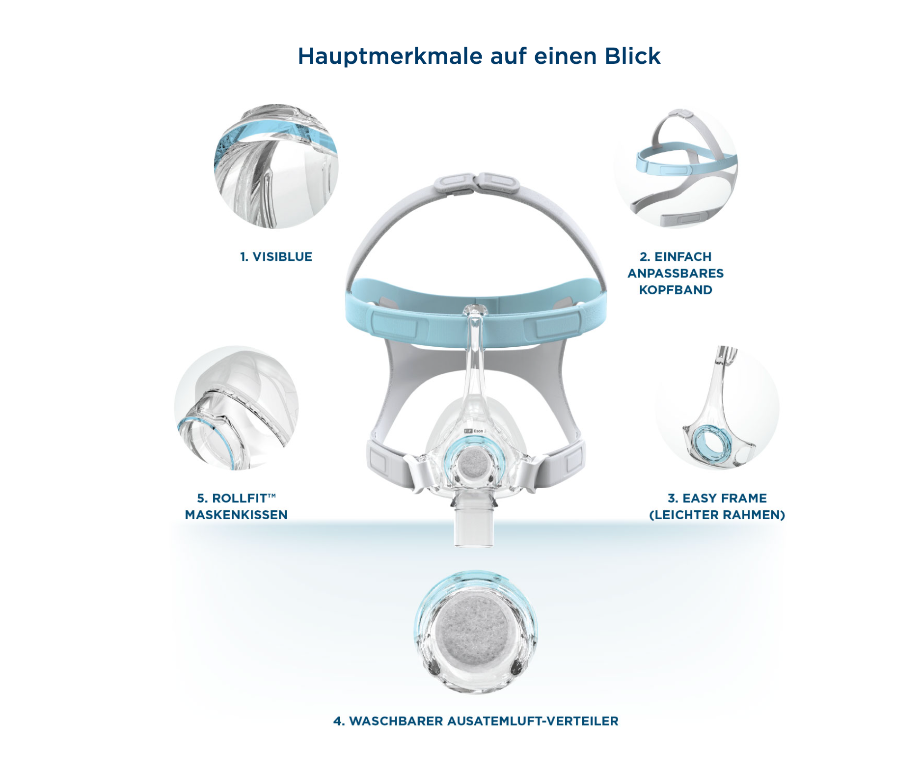 Das Kombipack der Eson™ 2 Nasalmaske wird mit einem passenden Ersatzkissen geliefert, und ihre VisiBlue™ Markierungen unterstützen den Patienten beim Anpassen, Auseinandernehmen und Zusammenbauen der Maske. Das flexible Kopfband bietet vielfältige Anpassungsmöglichkeiten, einschließlich der Option, die Maske direkt über den Kopf zu ziehen. Das Nasenkissen passt sich dank der RollFit Seal-Technologie automatisch dem Nasenrücken an, gewährleistet einen sicheren Sitz und eine zuverlässige Abdichtung. Das RollFit™-Maskenkissen wurde entwickelt, um sanft hin und her zu rollen, den Druck auf den Nasenrücken zu minimieren und eine effektive Abdichtung zu gewährleisten.