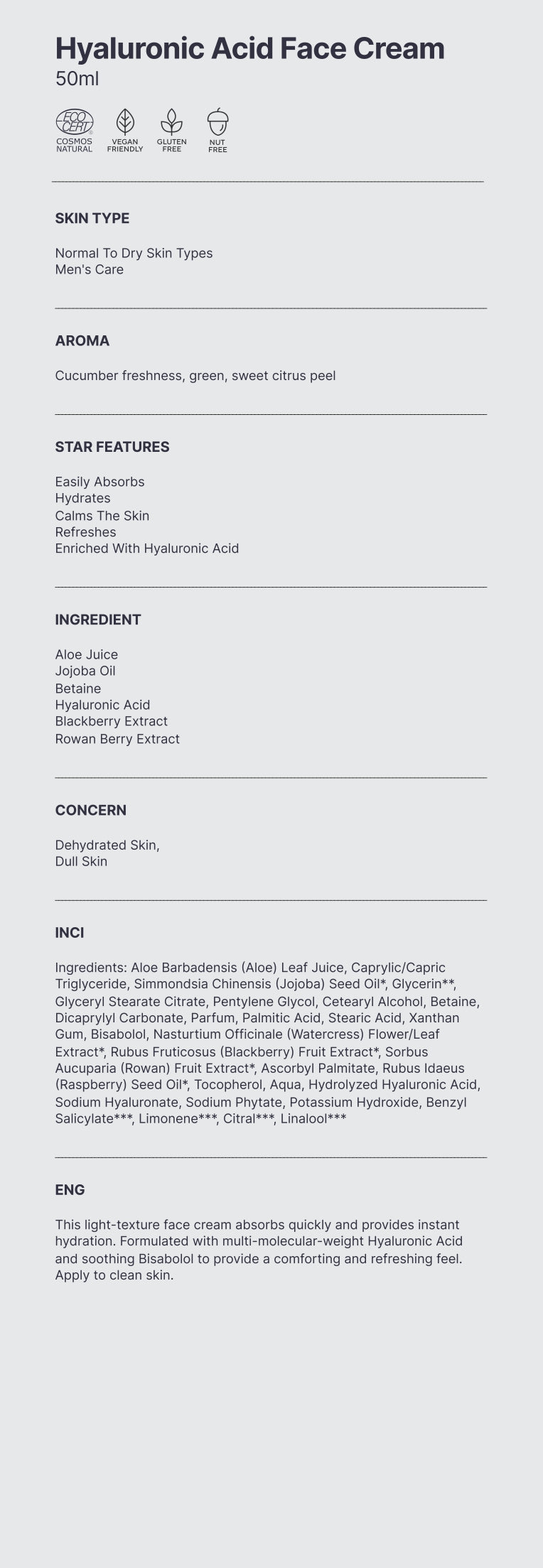 Aloe Barbadensis (Aloe) Leaf Juice, Caprylic/Capric Triglyceride, Simmondsia Chinensis (Jojoba) Seed Oil➀, Glycerin➁, Glyceryl Stearate Citrate, Pentylene Glycol, Cetearyl Alcohol, Betaine, Dicaprylyl Carbonate, Parfum, Palmitic Acid, Stearic Acid, Xanthan Gum, Bisabolol, Nasturtium Officinale (Watercress) Flower/Leaf Extract➀, Rubus Fruticosus (Blackberry) Fruit Extract➀, Sorbus Aucuparia (Rowan) Fruit Extract➀, Ascorbyl Palmitate, Rubus Idaeus (Raspberry) Seed Oil➀, Tocopherol, Aqua, Hydrolyzed Hyaluronic Acid, Sodium Hyaluronate, Sodium Phytate, Potassium Hydroxide, Benzyl Salicylate➂, Limonene➂, Citral➂, Linalool➂